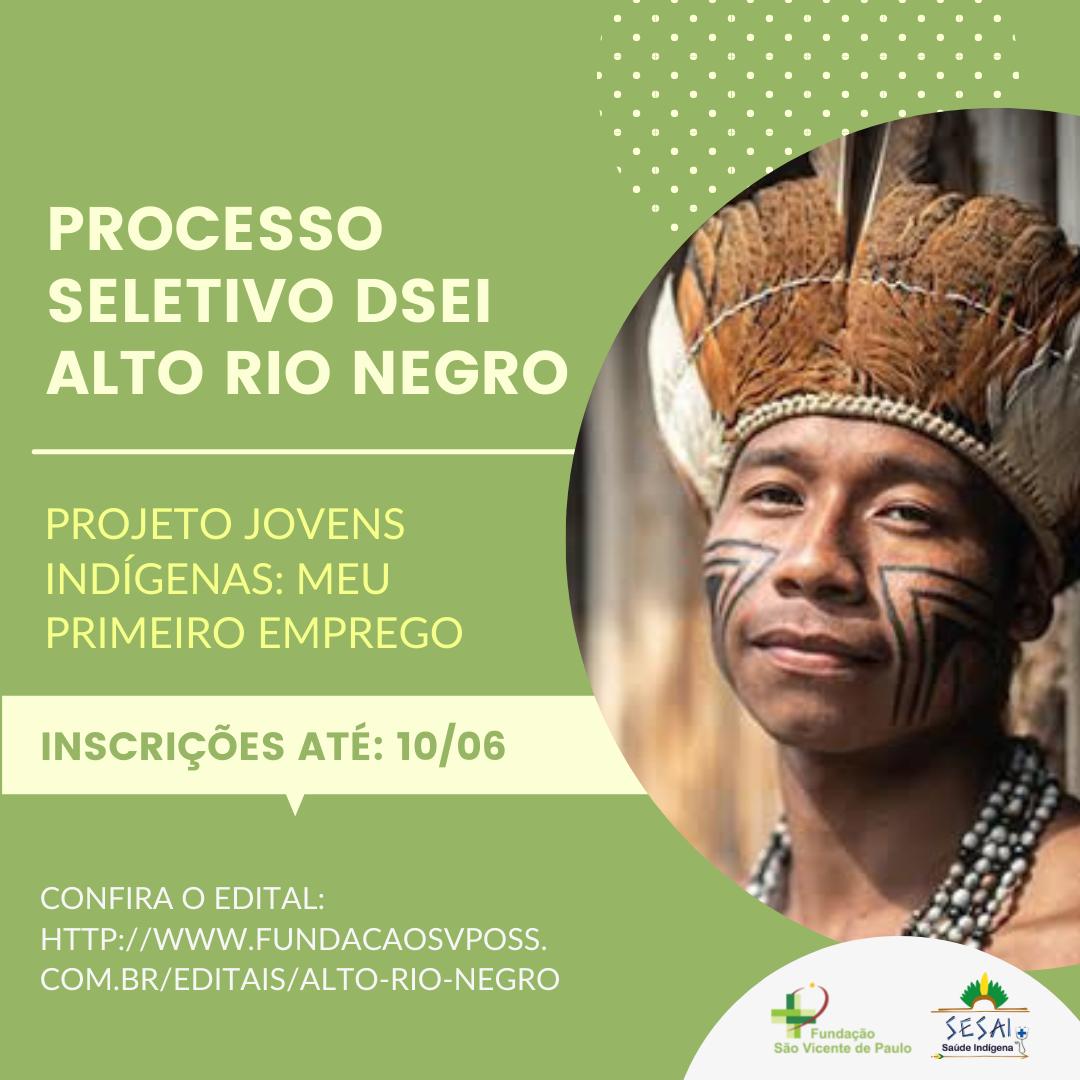 A Fundação São Vicente de Paulo de Paraopeba (MG) deu início ao Processo Seletivo do Distrito Sanitário Especial Indígena (DSEI) Alto Rio Negro para o “Programa Jovens indígenas: meu primeiro emprego” criado pela Secretaria Especial de Saúde Indígena (Sesai). As inscrições podem ser realizadas até o dia 12/06, através do e-mail: arnseletivojovemindigena@gmail.com .
