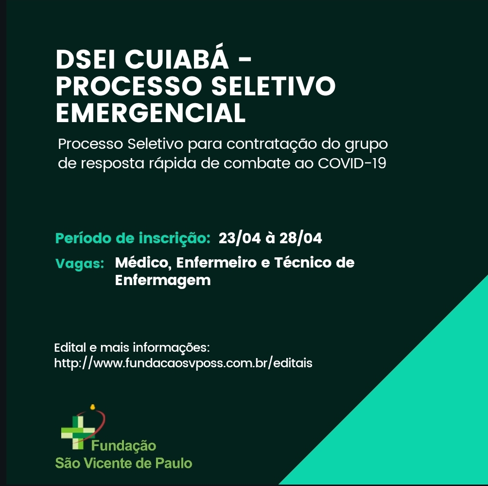 O Distrito Sanitário Especial Indígena (DSEI) de Cuiabá(MT) deu início nesta quinta-feira,23, ao  Processo Seletivo para contratação do grupo de resposta rápida de combate ao COVID-19 . As inscrições podem ser realizadas a partir de hoje até às 18 horas do dia 28 de abril. São 07 vagas no total, sendo 01 para médico, 02para enfermeiros e 04 para técnicos de enfermagem.
