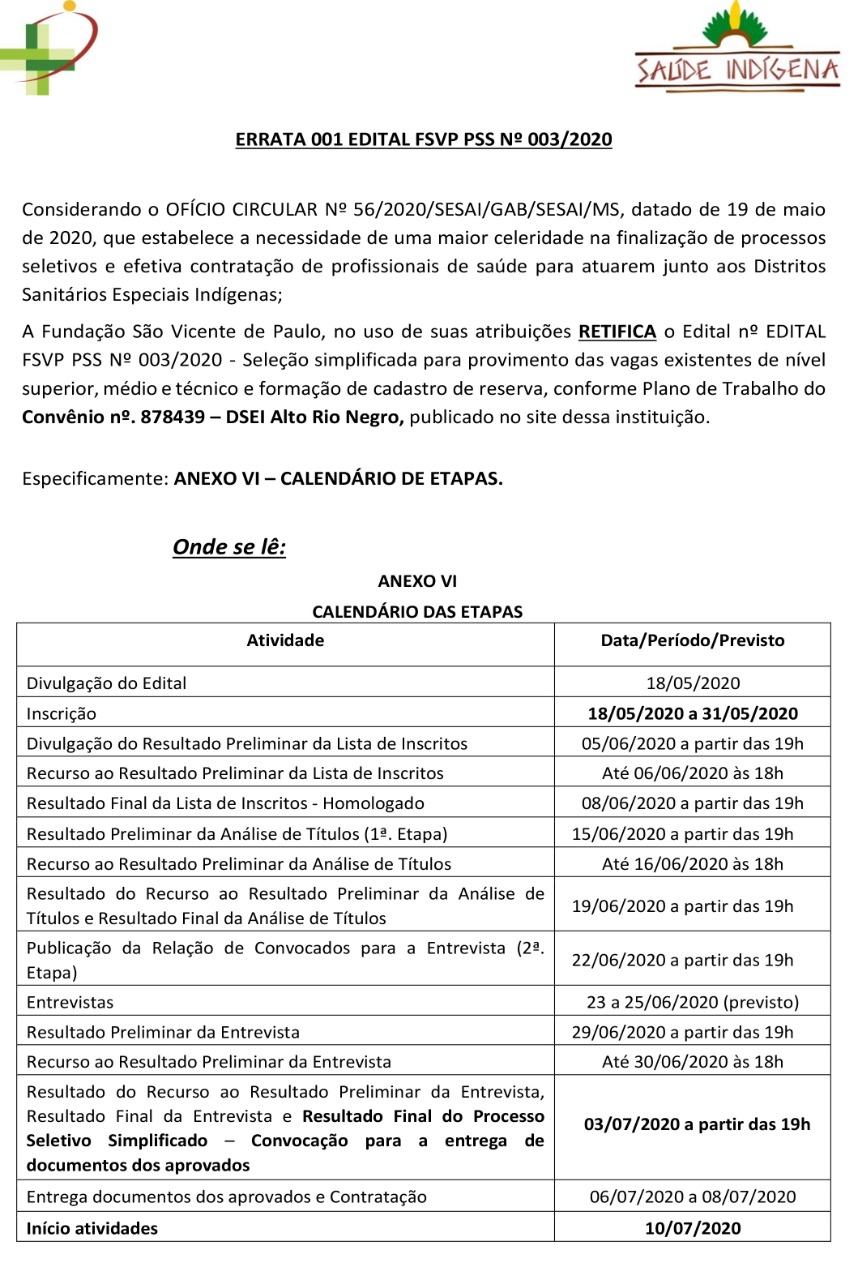 Em virtude da necessidade de uma maior celeridade na finalização de processos seletivos e efetiva contratação de profissionais de saúde para atuarem junto aos Distritos Sanitários Especiais Indígenas, a Fundação São Vicente de Paulo, no uso de suas atribuições, RETIFICA o Edital nº EDITAL FSVP PSS Nº 003/2020 que se refere ao Processo Seletivo Simplificado do DSEI de Alto Rio Negro para o preenchimento das vagas existentes de nível superior, médio e técnico e formação de cadastro de reserva, conforme Plano de Trabalho do Convênio nº. 878439.