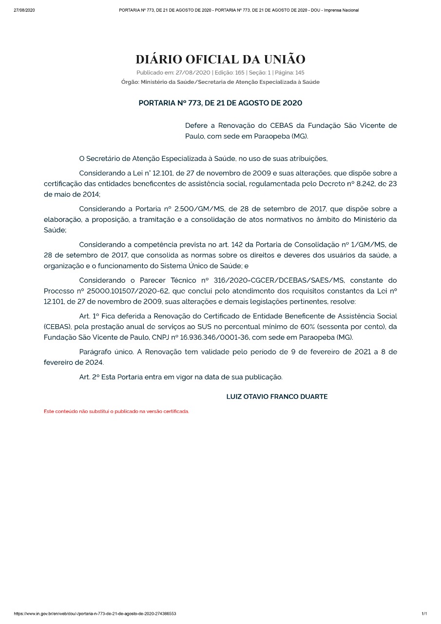 Por meio da Portaria nº 773, de 21 de agosto de 2020 publicada no Diário Oficial da União desta quinta, 27, a Fundação São Vicente de Paulo, com sede em Paraopeba (MG), teve a renovação do Certificado de Entidade Beneficente de Assistência Social (CEBAS) deferida pelo Ministério da Saúde.