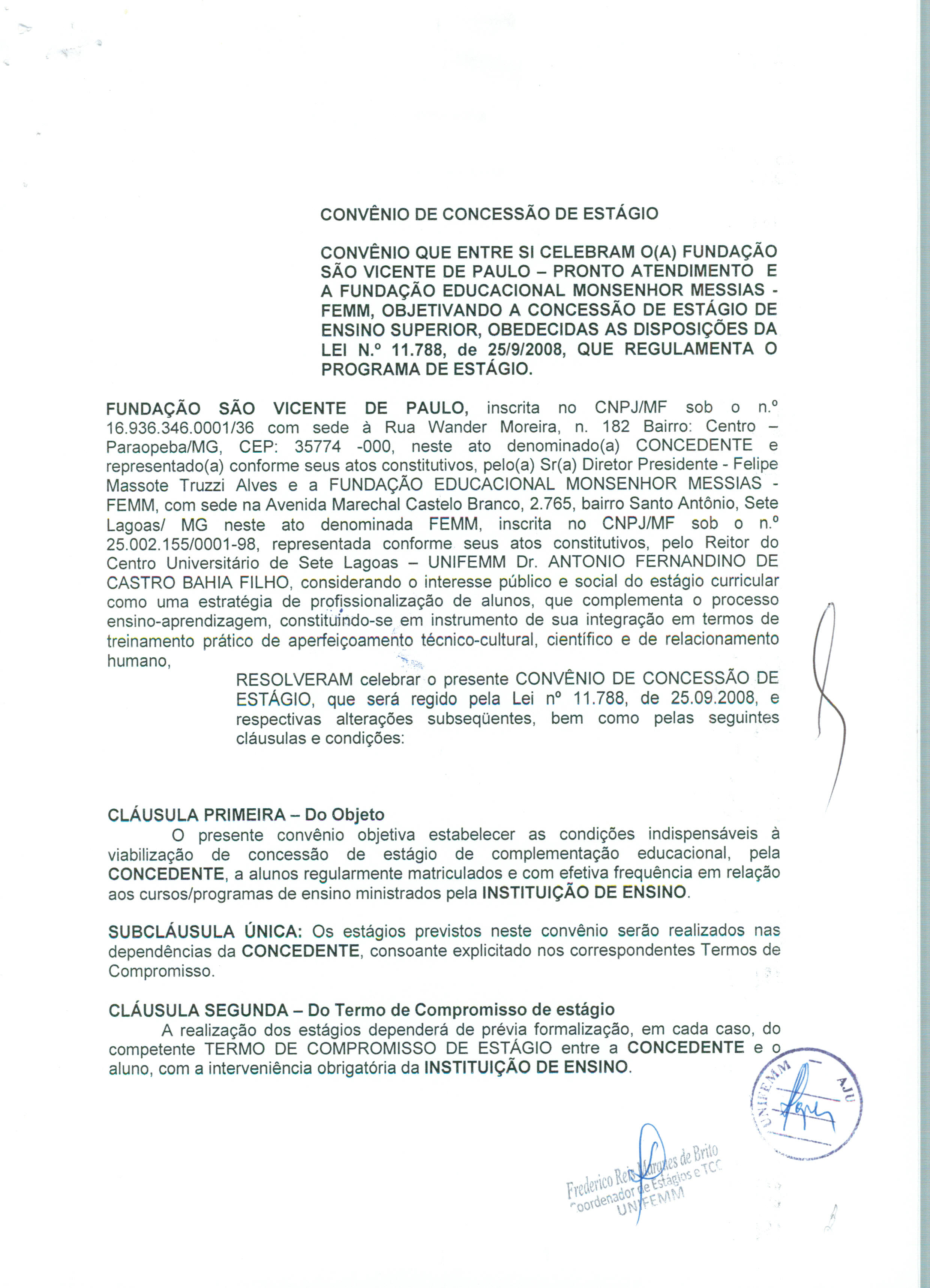 Com o objetivo de conceder estágio respeitando as disposições da lei que regulamenta o programa de estágio no Brasil (Lei 11.788 de 25/09/2008), a Fundação São Vicente de Paulo e a Fundação educacional Monsenhor Messias (FEMM) firmaram um Convênio de Concessão que permite os alunos do Centro Universitário de Sete Lagoas (MG) –UNIFEMM a estagiar no Pronto Atendimento do Hospital São Vicente de Paraopeba.