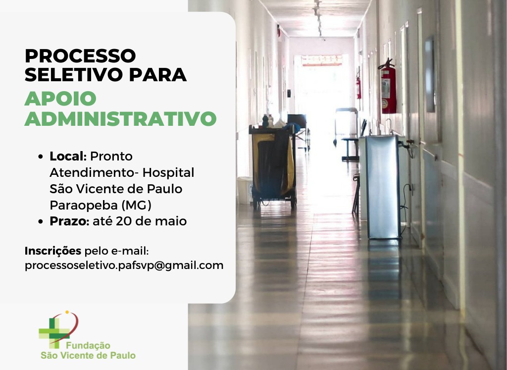 Dando continuidade as contratações imediatas e formação de cadastro reserva dos profissionais para compor o quadro de servidores do Pronto Atendimento do Hospital São Vicente de Paulo, a Fundação São Vicente de Paulo (FSVP) de Paraopeba (MG), inicia nesta sexta-feira, 13, o Processo Seletivo Simplificado para Apoio Administrativo.
